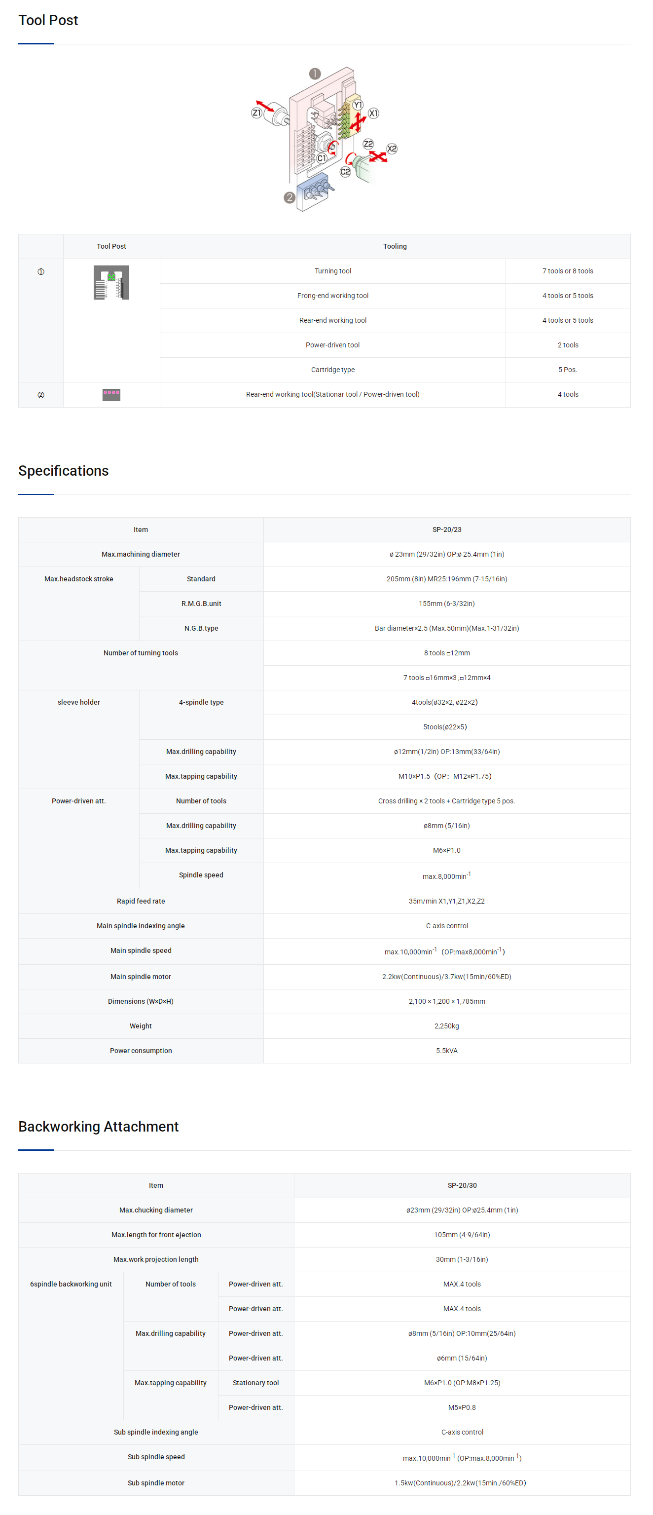 •Equipped with a 7-spindle cross drilling unit at the rear of the front-side tool post. A wide variety of tool units can be mounted on the 5 cartridge positions.