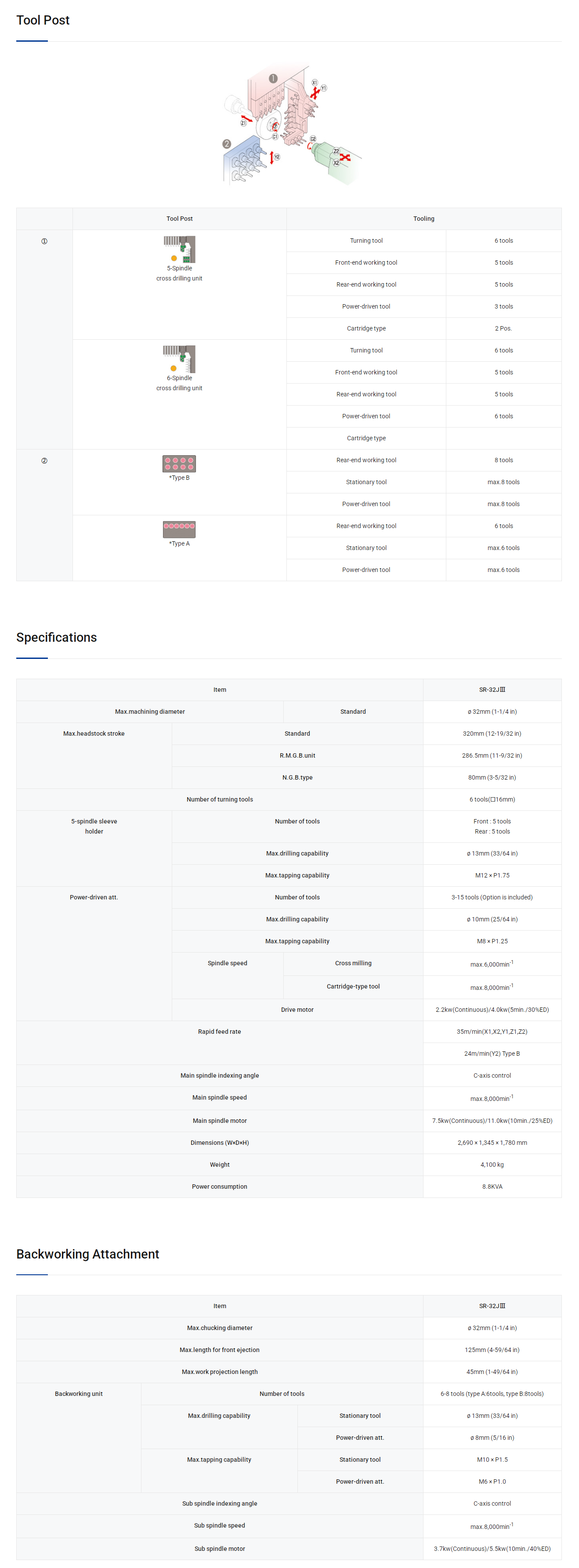 • Type A is equipped with a 6-spindle type and Type B is equipped with Y-axis control / 8-spindle type backworking tool post.