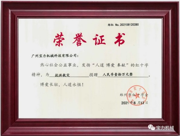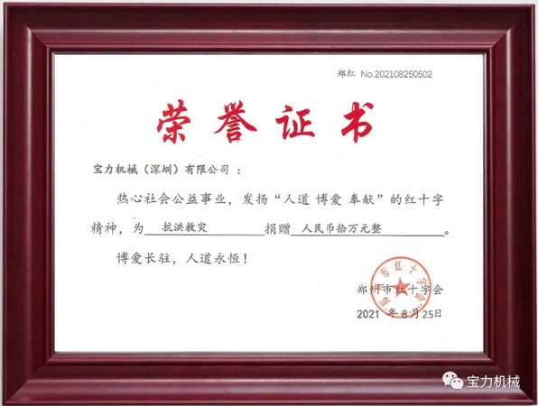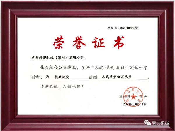 [宝力集团]是以广州宝力机械科技有限公司、宝惠精密机械(深圳)有限公司、宝力机械(深圳)有限公司3家公司的名义向郑州市红十字会分别捐款10万元人民币,共计30万元,将用于河南郑州救灾紧急举措和灾后恢复工作,尽微薄之力、为河南人民加油。