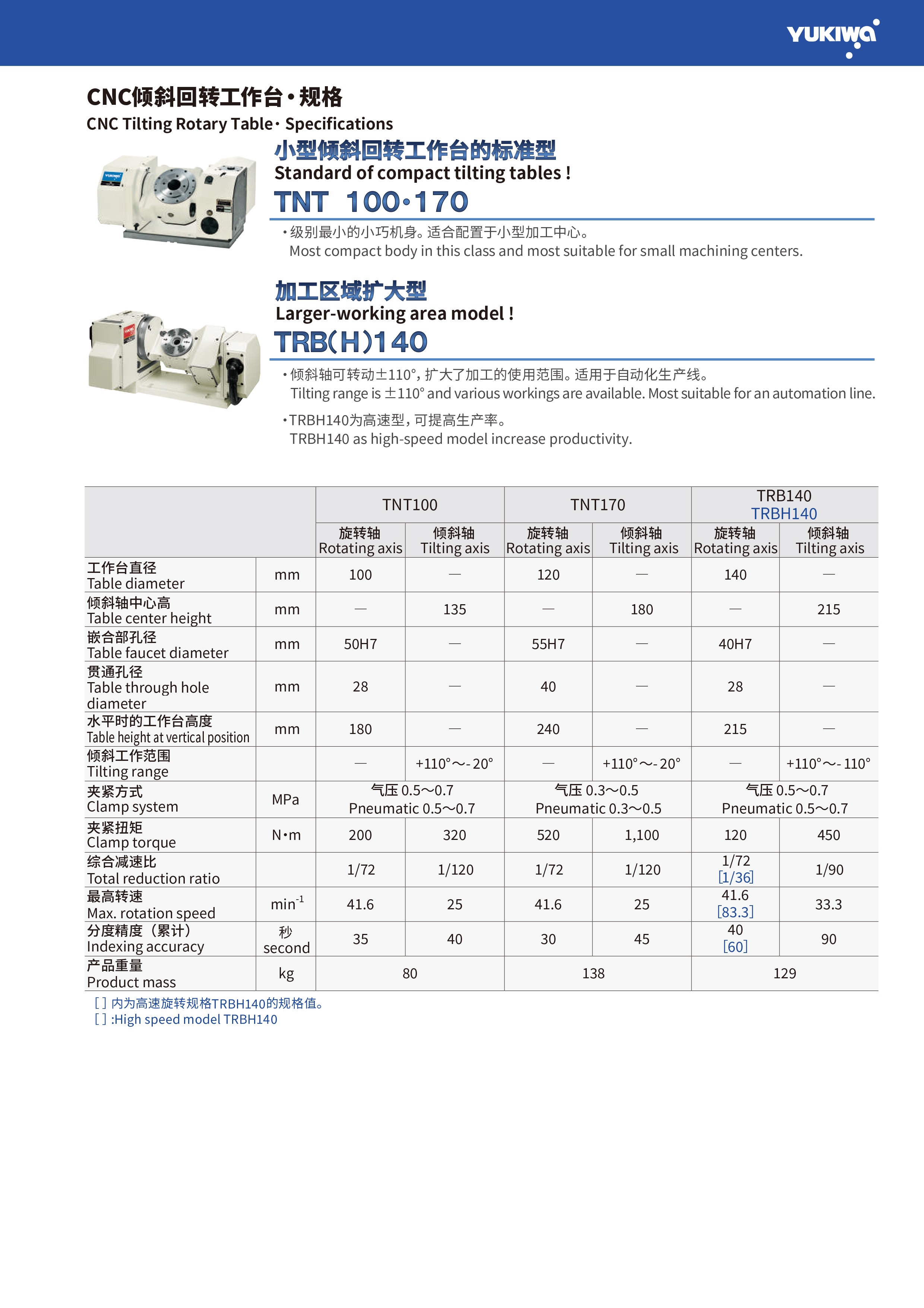 YUKIWA 小型倾斜回转工作台的标准型 TNT 100•170、加工区域扩大型 TRB(H)140