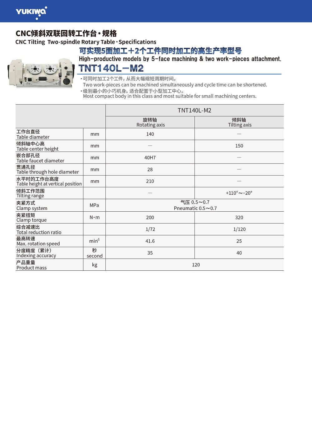 YUKIWA 可实现5面加工+2个工件同时加工的高生产率型号 TNT140L-M2
