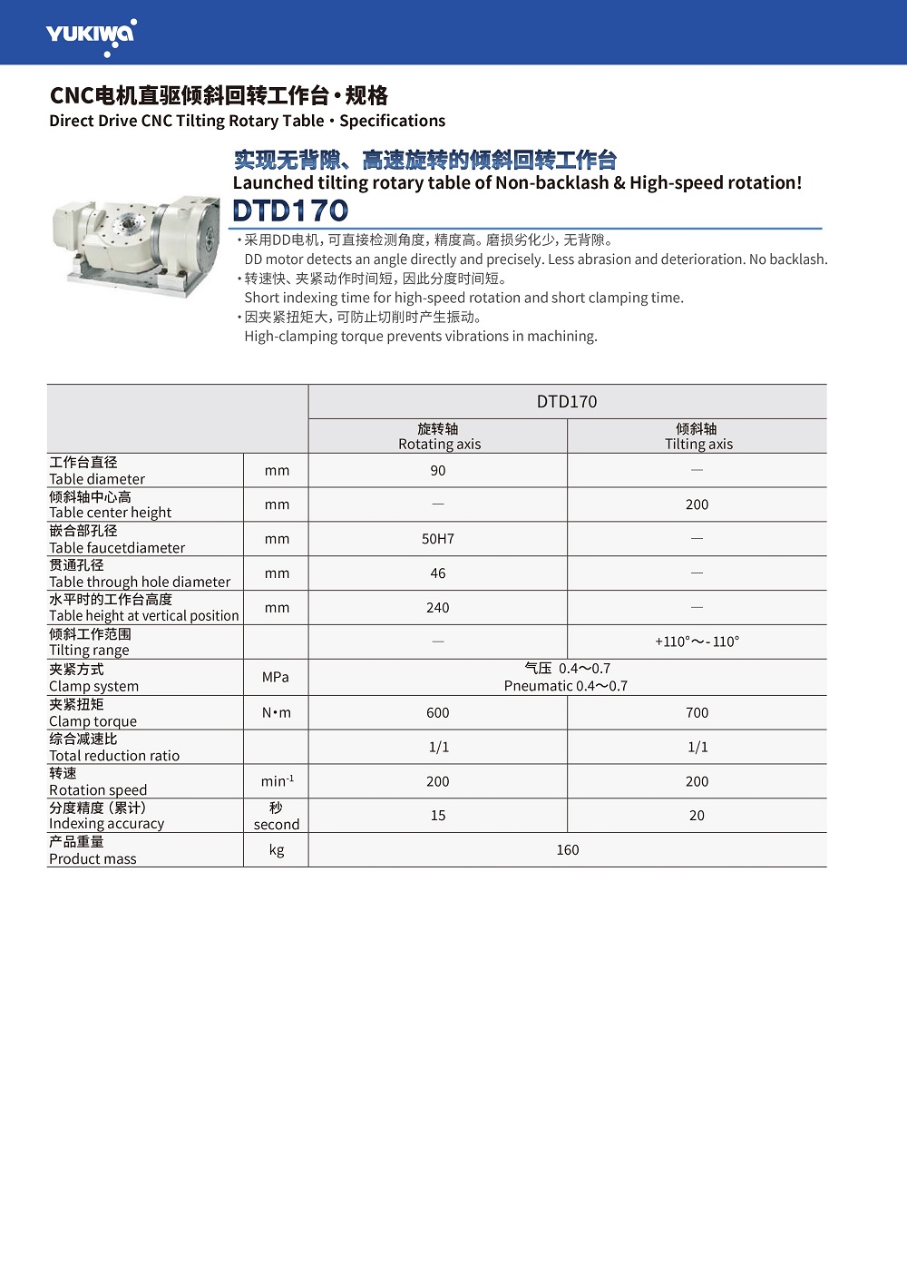 YUKIWA 实现无背隙、高速旋转的倾斜回转工作台 DTD170