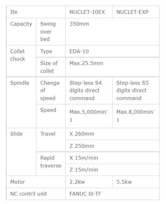 • Spindle built-in motor of 10,000 rotation per minute is mounted, Optical scales, of 0,1 um resolution are adopted for both X and Z axes. Together with standard model NUCLET-10EX NUCLET-10EXP makes a line-up for customers’ selection. Good operation ability