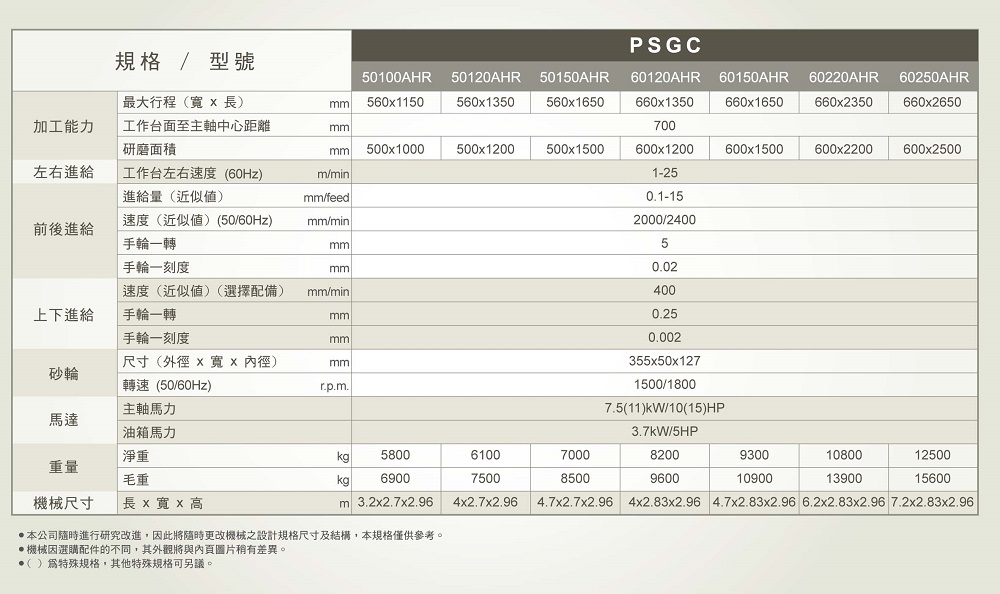 - 工作臺左右滑道長度遠長於臺面之長度(一般均為等長)而與工作臺長度相等,如此工作臺於高速運動中不會發生扭曲變形而失去精度(PSGS系列除外)。