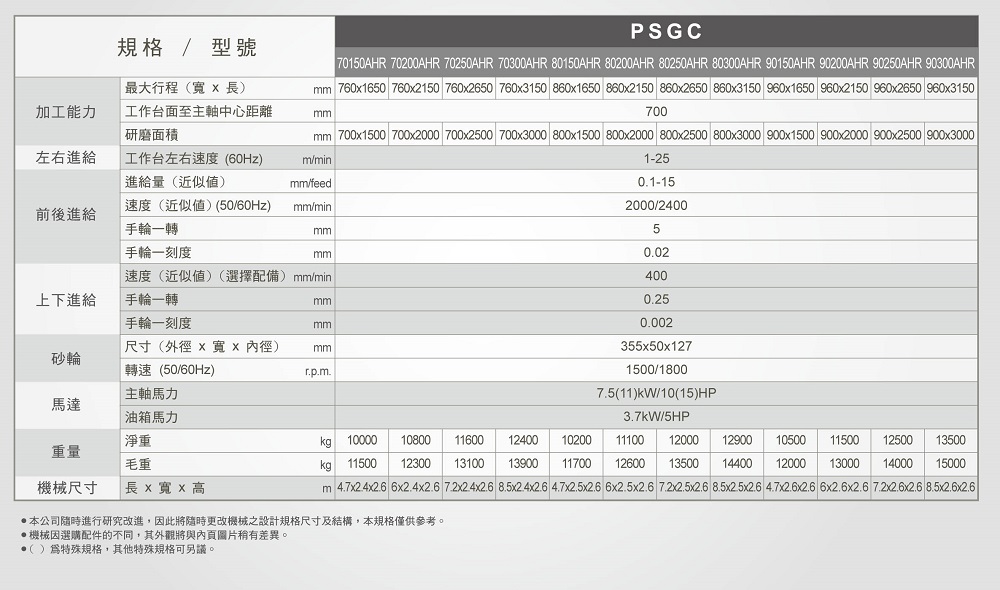 - 工作臺左右滑道長度遠長於臺面之長度(一般均為等長)而與工作臺長度相等,如此工作臺於高速運動中不會發生扭曲變形而失去精度(PSGS系列除外)。