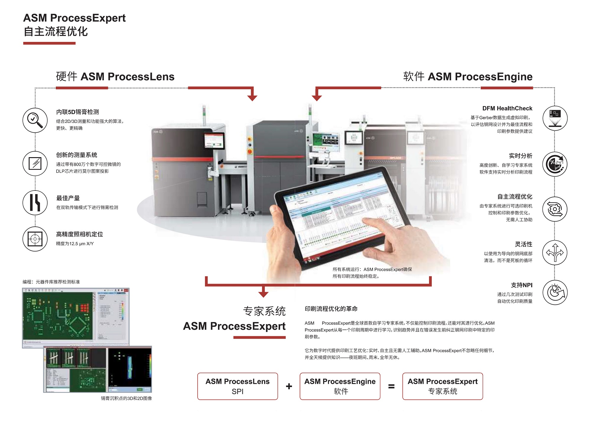 ASM ProcessExpert是全球首款自学习专家系统,不仅能控制印刷流程,还能对其进行优化。ASM ProcessExpert从每一个印刷周期中进行学习,识别趋势并且在错误发生前纠正钢网印刷中特定的印刷参数。