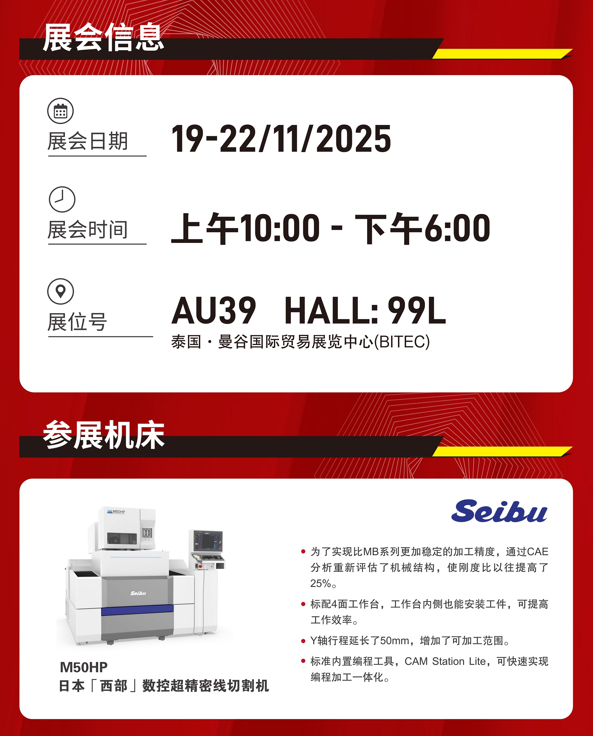 本次参展,我们将携日本「西部」数控超精密线切割机、日本「STAR」瑞士型CNC 自动车床以及「精智锐」高压油泵系统重磅亮相,现场演绎高效加工技术与数字化转型实践。观众可零距离体验创新科技与应用案例,洞察制造业前沿趋势,探索合作新机遇。我们诚邀您莅临展位(Booth No:AU39 HALL:99L),亲身体验创新技术与数字转型成果,深入交流,共同探索合作新机遇。 |