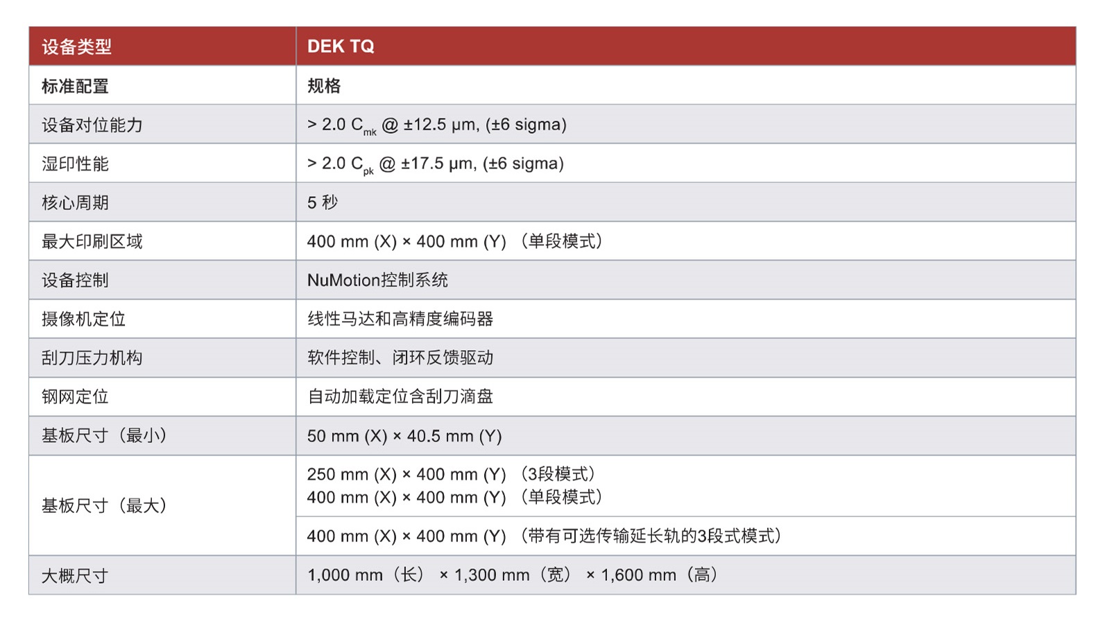 DEK TQ标志着新一代钢网印刷机的诞生。新一代DEK印刷机TQ采用全新设计,更加精准、强大、和开放,同时具有更低的维护成本。新的线性马达、离带PCB板和皮带脱离印刷和创新的夹板系统确保精度达到一个新水平,并提供了稳定的印刷制程——即使是最小的公制0201元器件也可轻松应对。在新的DEKTQ中,精度和速度同时满足您对未来的需求。新的三段式传输和独特的基于光纤通信的ASM Numotion 控制将周期时间缩短到5秒,同时在最小的空间内提供高精度性能。