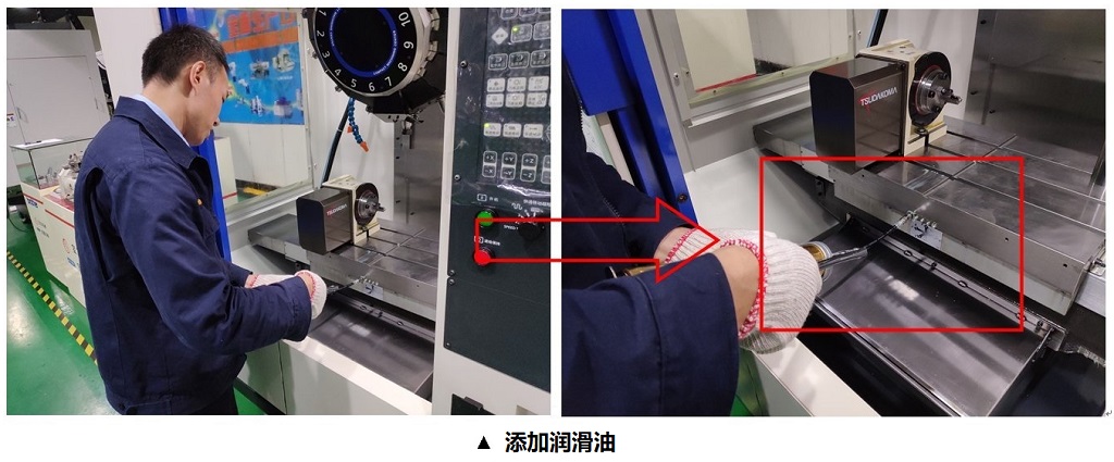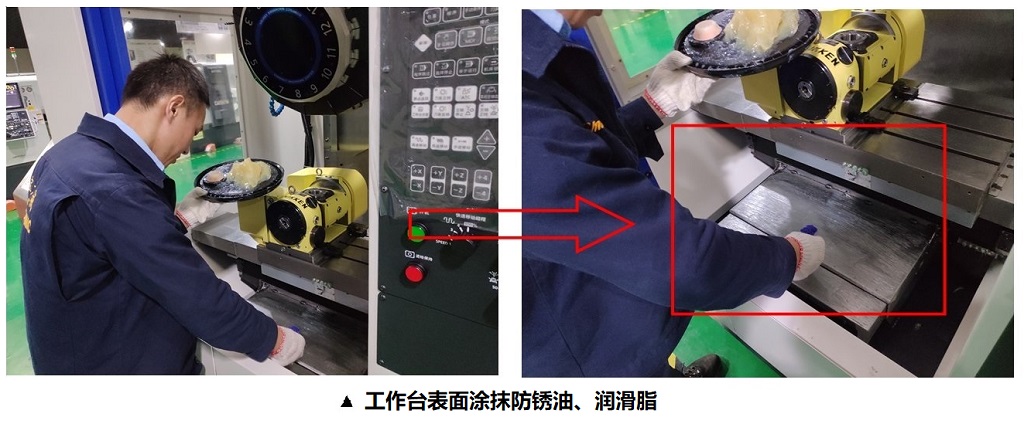 2、使用规定型号油脂,给各轴添加润滑脂,全行程移动各轴,让丝杆和导轨表面充分布满润滑脂,然后将X、Y、Z轴在行程停在机床中心位置。(防止工作台停在其他位置,重量偏置,停久了机床负重不均匀。)