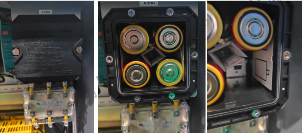 建议1年更换1次绝对轴编码器电池,避免零点丢失。在机床上电的情况下,打开电柜,在电柜右上角找到黑色的绝对轴编码器电池盒,使用一字螺丝刀打开下图盖子,按照盒子内壁的电池方向安装四节1号电池。