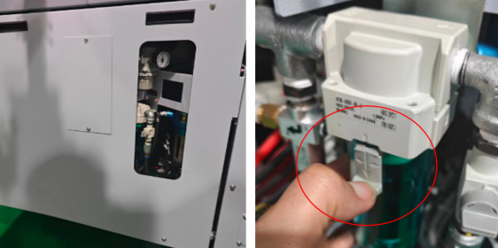 松开6个螺丝拿下左侧钣金,左侧机床外露气动单元,如下图,气源过滤装置滤芯需要定期更换。首先关闭机床气源,按箭头方向下拉扣子,另一只手抓住圆柱形部件顺时针或逆时针旋转45°左右即可取出组件。