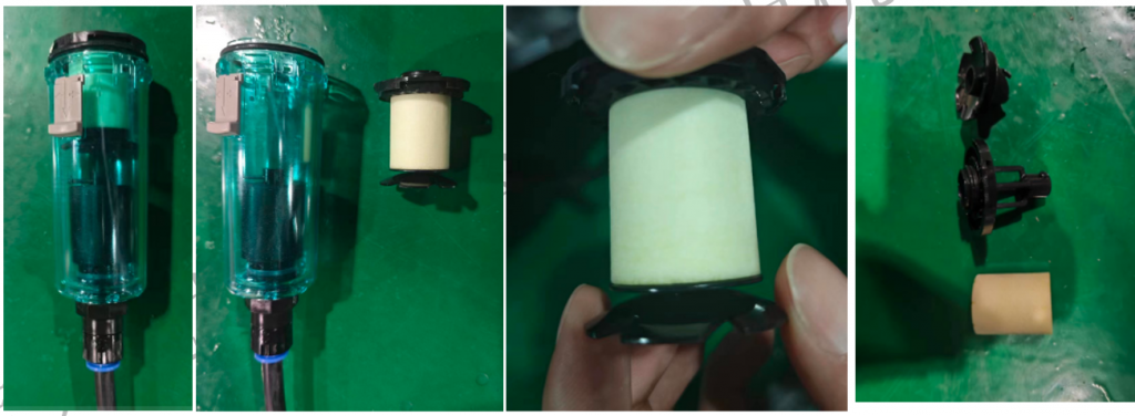 取出部件后,将上方的滤芯带底座取出。取出后一手抓上部,一手抓下部,下部旋转一定角度可以分体取出滤芯。滤芯可以使用压缩空气清洁,如条件允许可以使用中性清洁溶剂清洗。如滤芯过滤性能不足,或变色严重则需要更换。